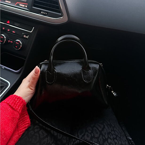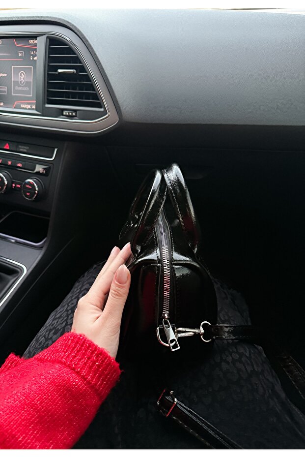 Siyah Suni Deri Kırışık Kumaş Tek Bölmeli Fermuarlı Ayarlanabilir Askılı El Omuz Çantası